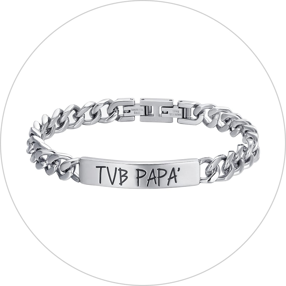 Très polyvalents et toujours appréciés, les bracelets d'homme. Si votre père préfère les bijoux sobres et minimalistes, capables d'enrichir son look sans être ostentatoires, il appréciera les modèles avec des bracelets en cuir. Encore mieux s'ils sont enrichis d'une plaque d'acier avec une dédicace personnalisée. Dans notre catalogue, vous trouverez des bracelets avec inscription "Super Papa" ou "TVB Papa", des messages qui semblent simples, mais qui sont en fait capables d'enthousiasmer et de faire naître un sourire sincère sur votre visage.