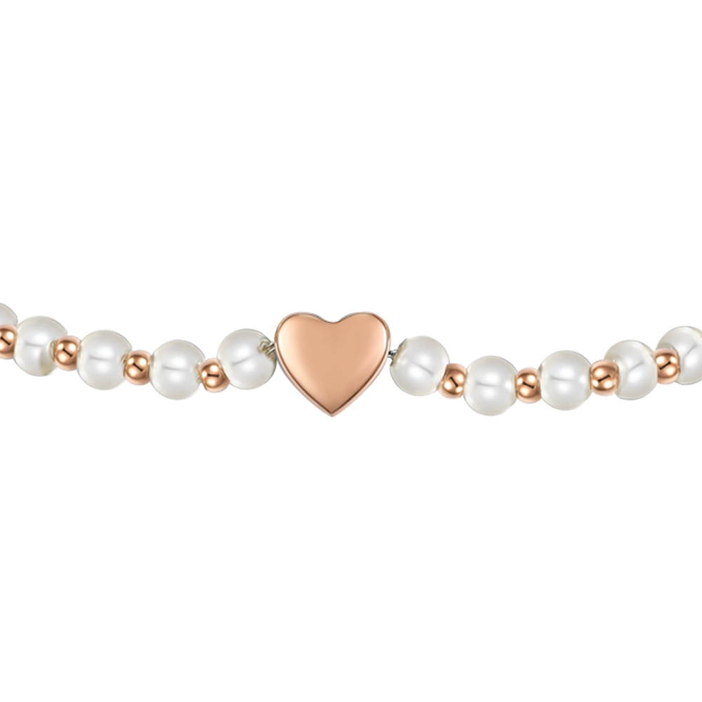 BRACCIALE DONNA IN ACCIAIO IP GOLD E PERLE SINTETICHE BIANCHE CON CUORE IP ROSE